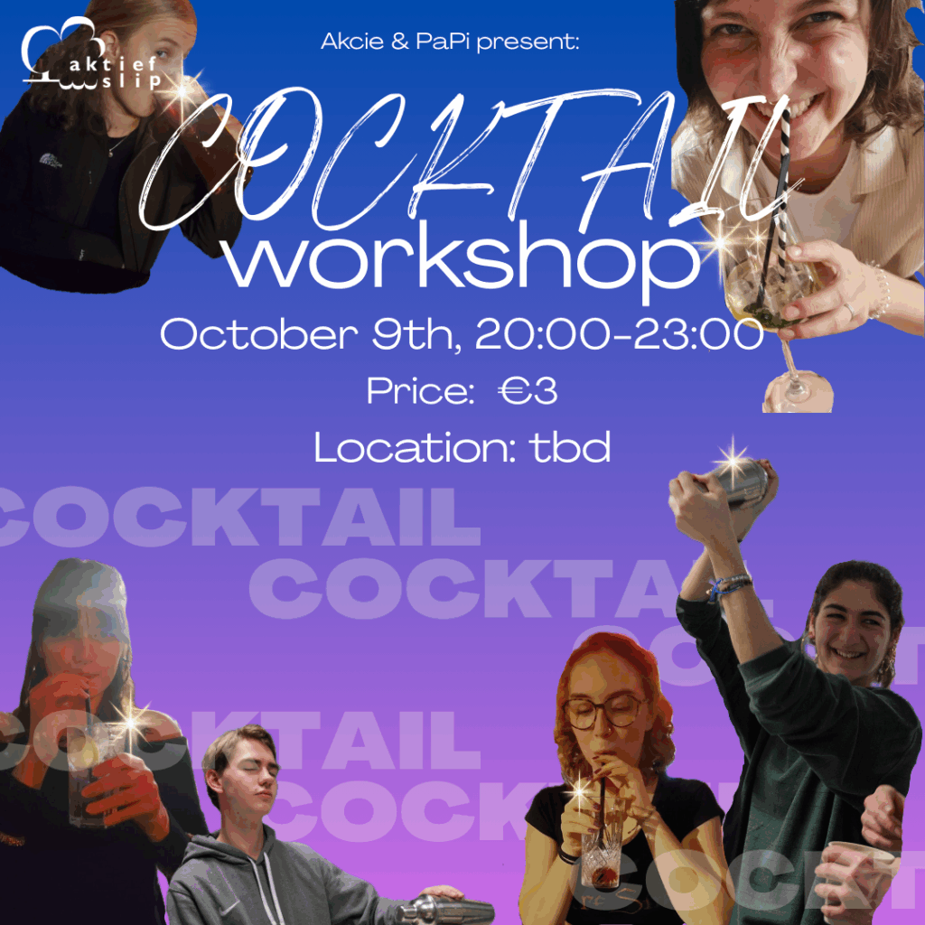 Join us on an unforgettable evening of cocktail-making, socialising and drinking! 🎉 The event will take place on October 9th at 20:00 in Forum. We will be making (and tasting😜) an assortment of delicious cocktails together (with some alcohol-free options).