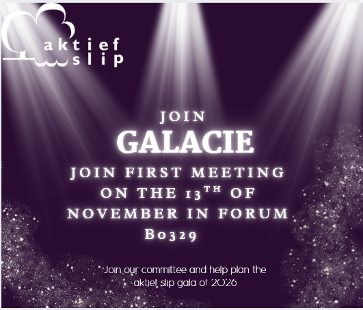 When: 13th November 13:15 to 14:00Where: Forum B0329Every two years Aktief Slip throws a glamourous gala for all members and some special plus ones. This year our gala committee ‘galacie’ is out of its dormant period and ready to plan the gala of 2026. If you are interested in gaining some organizational, communicational and planning […]